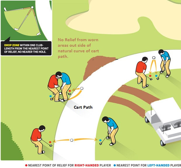 Relief is only for areas that are made specifically for the purpose of carts and does not include worn areas to the sides of the natural curve of the path. Nor does it include areas worn from maintenance vehicles. Best judgement must be made during play by the majority of the group playing and may not be brought to the committee for ruling. Remember it is up to each competitor to protect the field.